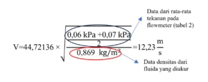 Berikut contoh perhitungan kecepatan alir pada D1, dimana tekanan yang digunakan adalah tekanan rata-rata dan densitas gas yang digunakan bergantung pada suhu dan komposisi gas. Densitas gas untuk kasus ini diasumsikan menggunakan densitas udara pada suhu 133°C (pengukuran) yaitu 0,869 kg/m3 (Engineering Toolbox)